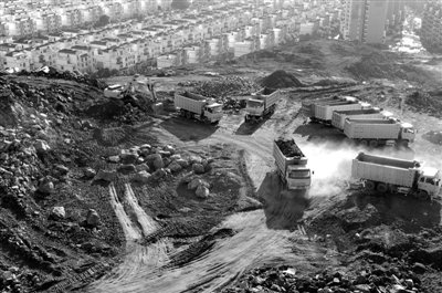 6月1日,廣西防城港市,眾多車輛在挖山造城。圖/CFP
