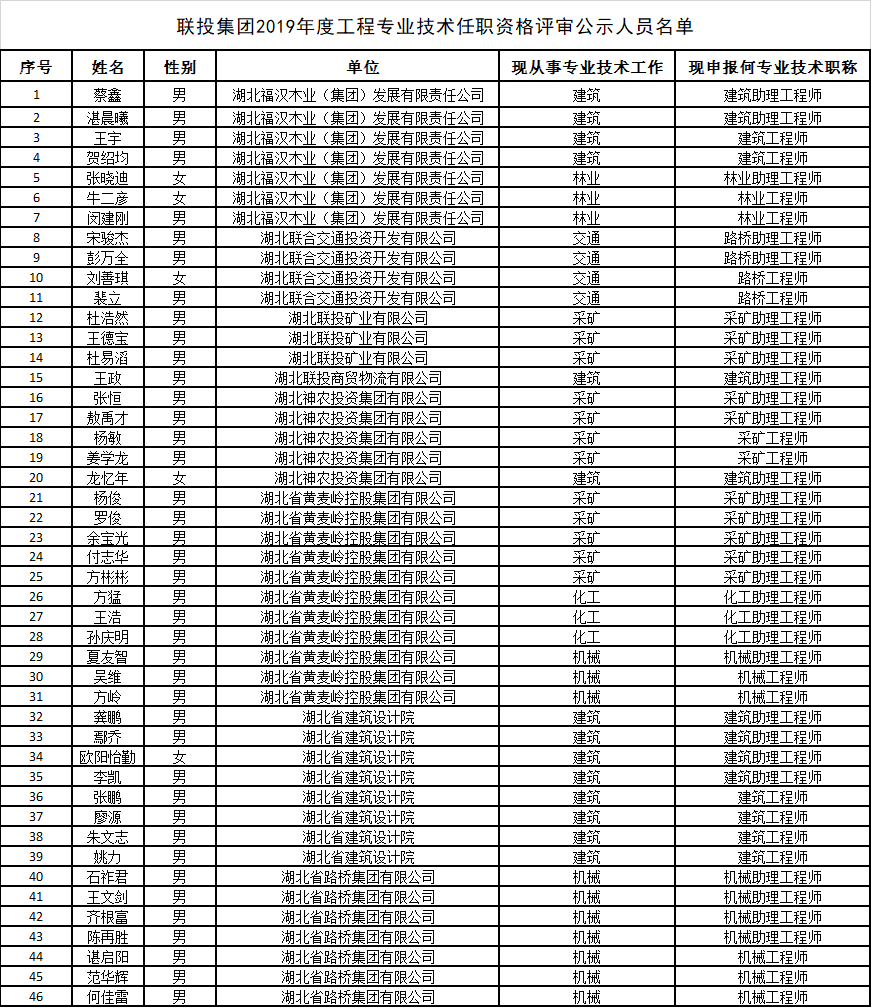附件:聯(lián)投集團(tuán)2019年度工程專業(yè)技術(shù)任職資格評審公示人員名單